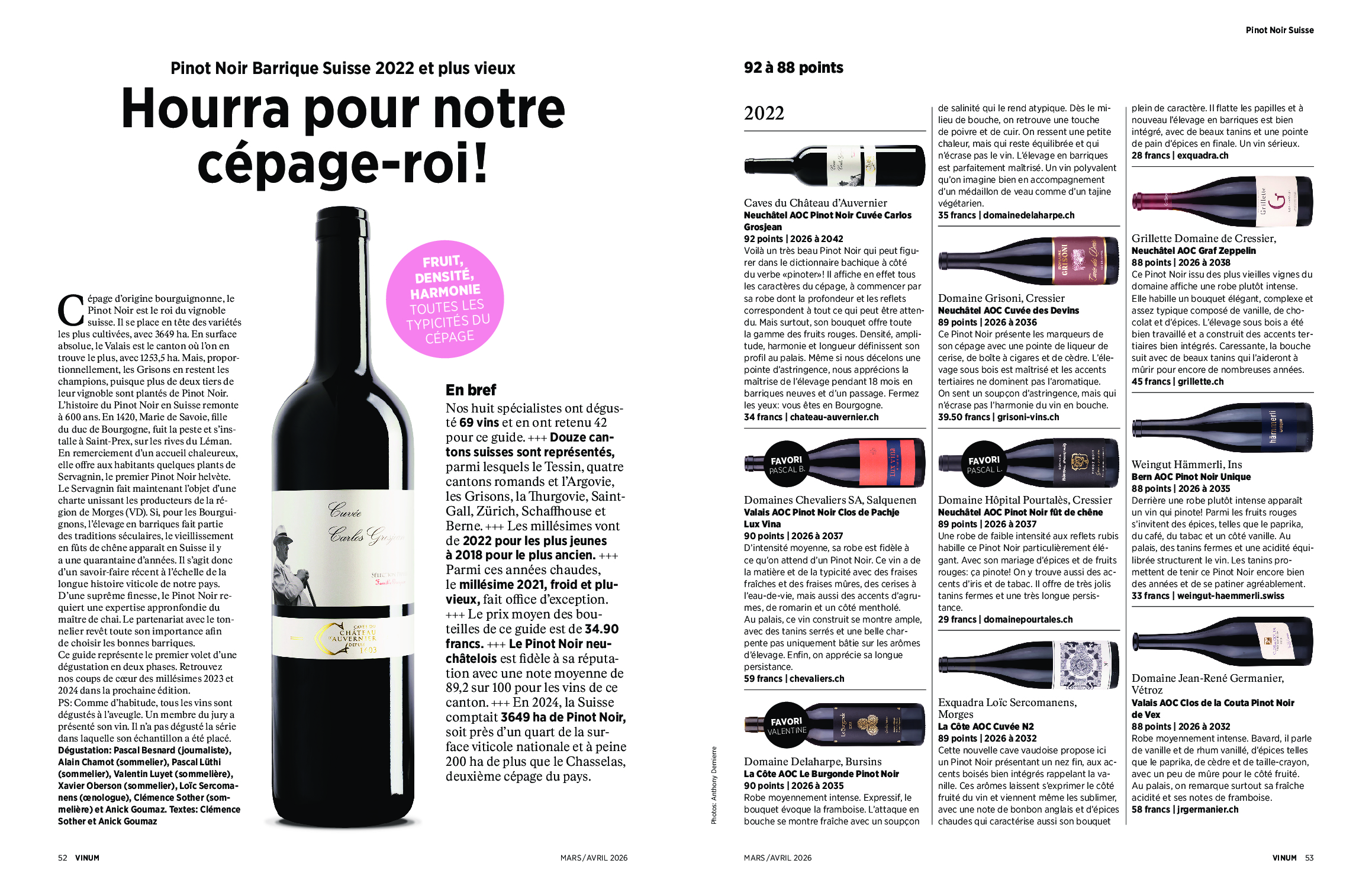 Dégustation du magasine Vinum des pinot Noir Suisse élevés en barrique